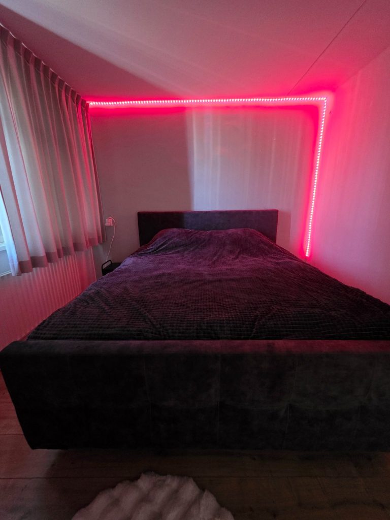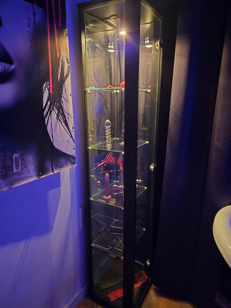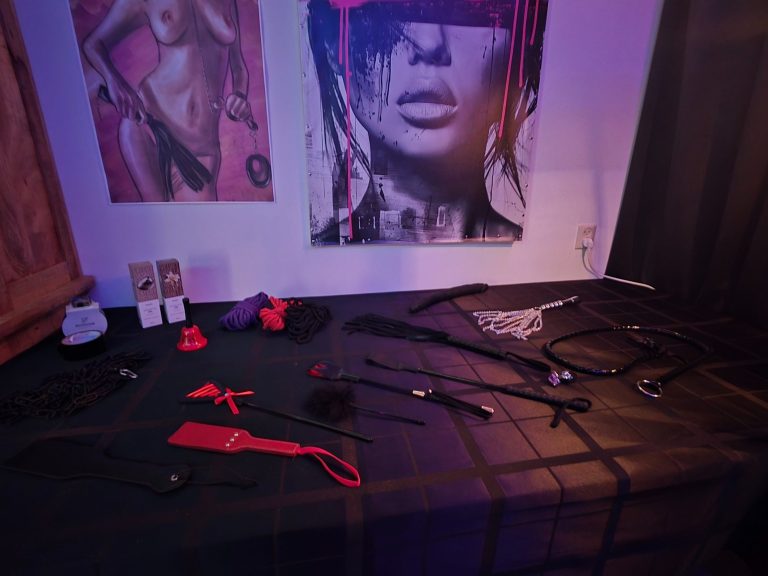 Er staan leuke toestellen in de woonkamer zoals een swing, strafbankje, andreaskruis en allerlei zwepen, handboeien, kettingen, touwen, leren riemen en pakjes.