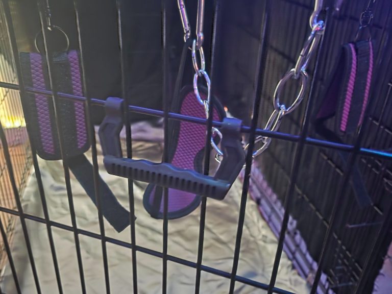 een kooi met tralies en op verschillende plekken handboeien, kettingen en musketonhaken.  Daarnaast is er ook een latexdoek om de kooi geheel af te sluiten